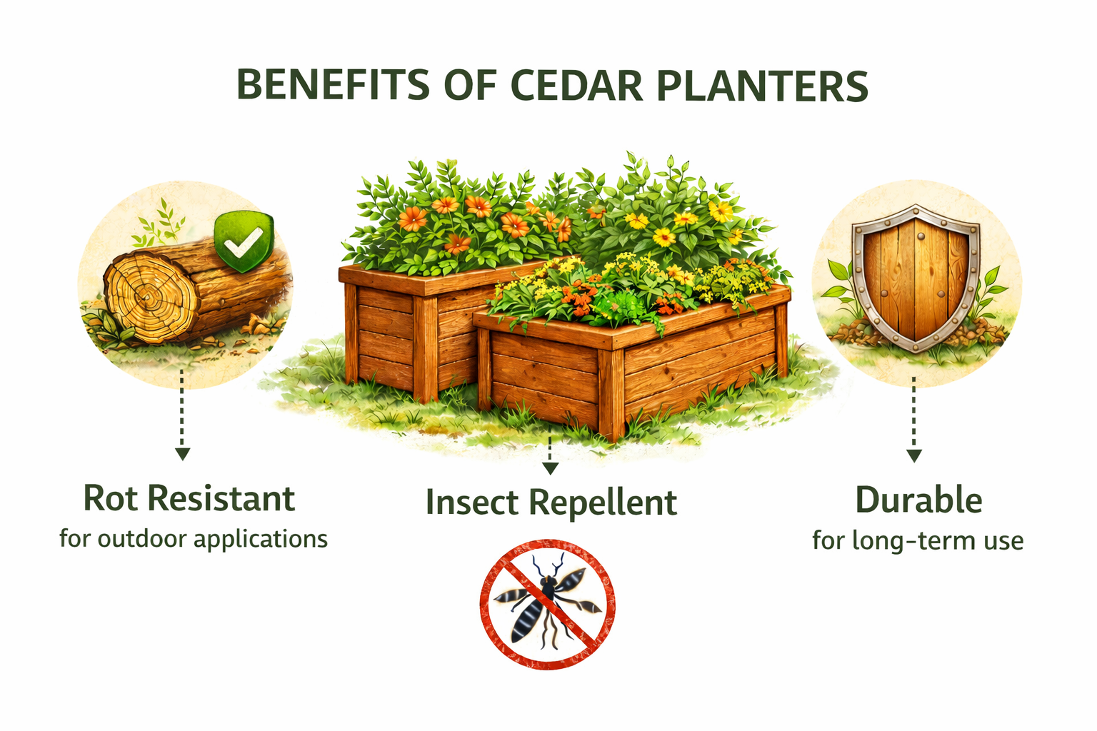 This sturdy, handcrafted cedar planter measures 5 feet long, 15 inches wide, and 17 inches tall, with an inner box depth of 11 inches—perfectly sized for a variety of plants. Built from naturally rot-resistant cedar, it’s designed to last while adding warm, natural charm to patios, porches, balconies, and garden beds.